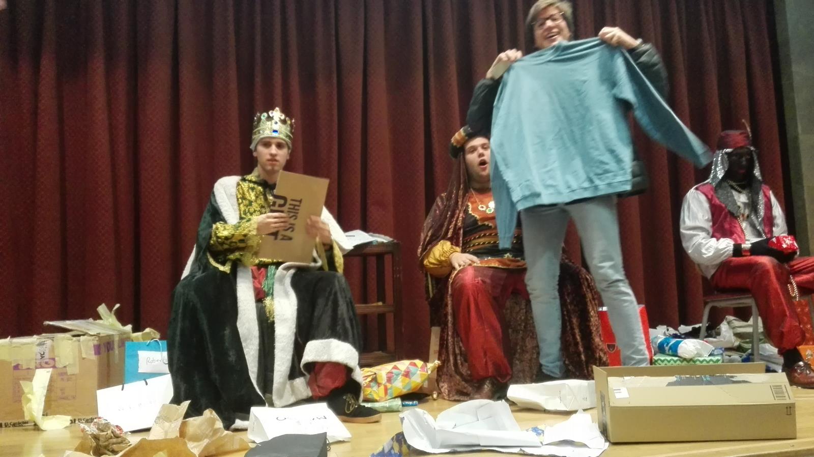 El sábado 13 de Enero, tres residentes del Mayor se vistieron de Reyes Magos y fueron recibidos en el balcón de Dirección con entusiasmo. La tradicional batalla campal de caramelos dio paso a la entrega del amigo invisible en el salón de actos.
